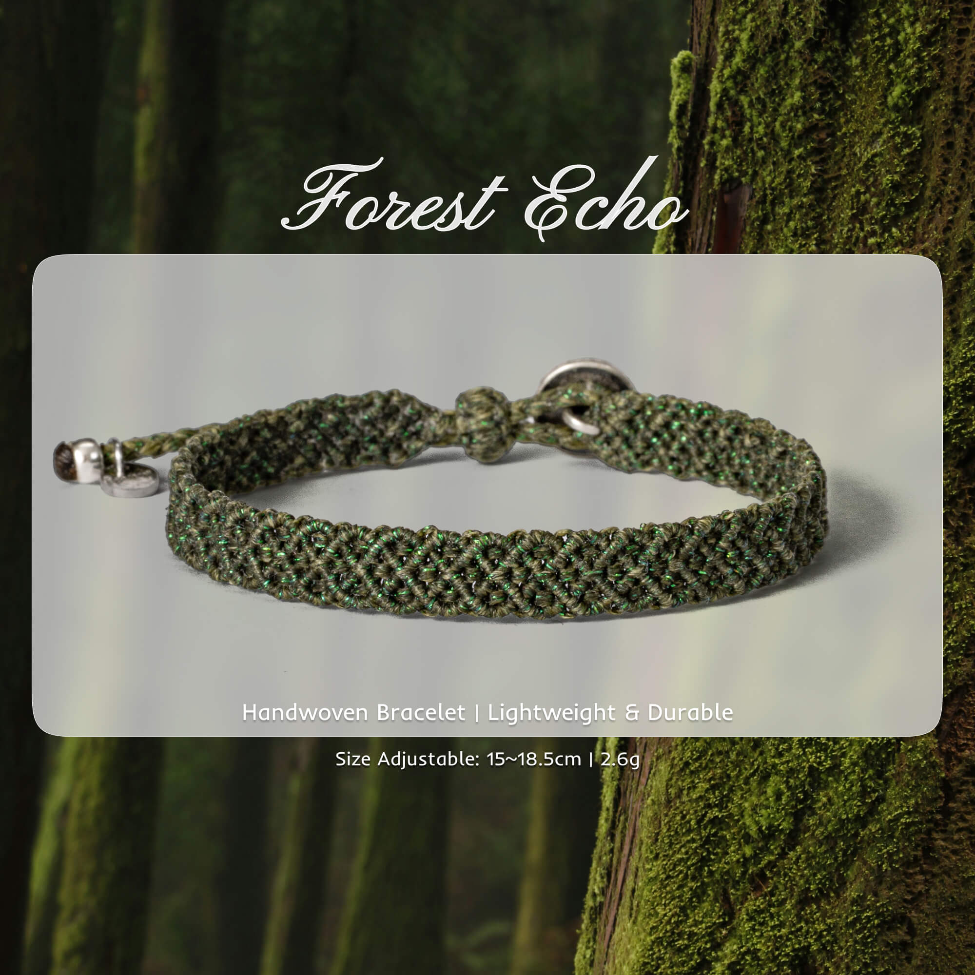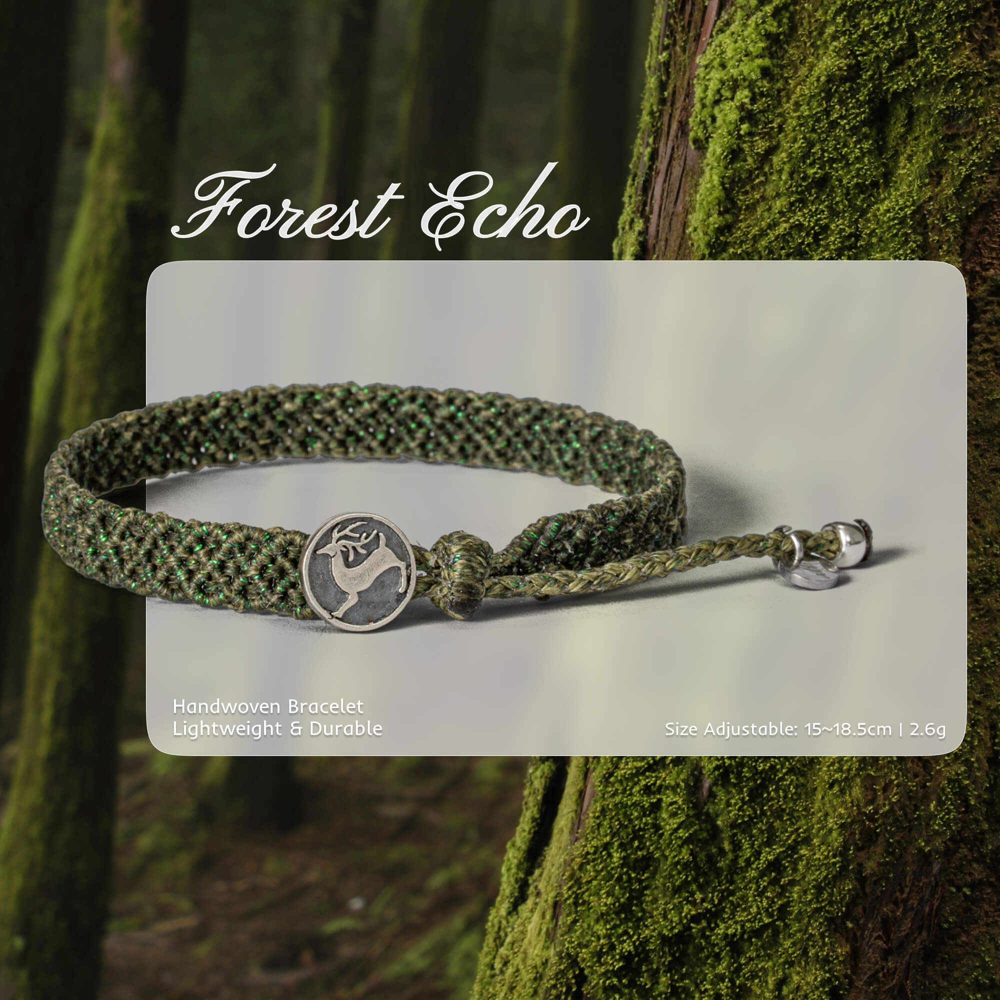 Inspired by the quiet strength of ancient woods, Forest Echo is a handwoven bracelet that speaks to those who feel at home among trees and trails. Its rich forest green tones, interlaced with subtle shimmer, reflect the dappled light of a sunlit canopy. Woven with care and finished with a distinctive silver-tone deer button, this piece is both rugged and refined—perfect for nature lovers, adventurers, and those who carry the wilderness with them. Whether worn solo or layered, it’s a timeless tribute to the wild within.